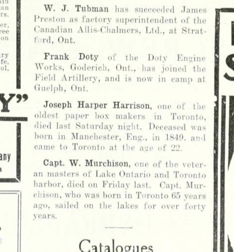 Joseph Harper Harrison obituary, Canadian Machinery and Manufacturing News, MacLean-Hunter, Toronto, Canada; 2 December 1915, vol. 14, no. 23, p. 50, col. 2.
